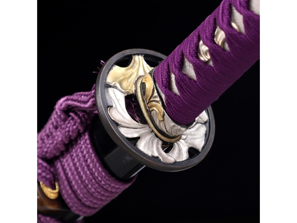 • Tsuka (rukojeť) - dřevěné jádro, potažena pravou rejnočí kůží (Samegawa), s fialovou hedvábnou omotávkou ITO. Čepel zajištěna 2 bambusovými kolíky "mekugi". Z obou stran najdete menuki (ornament).