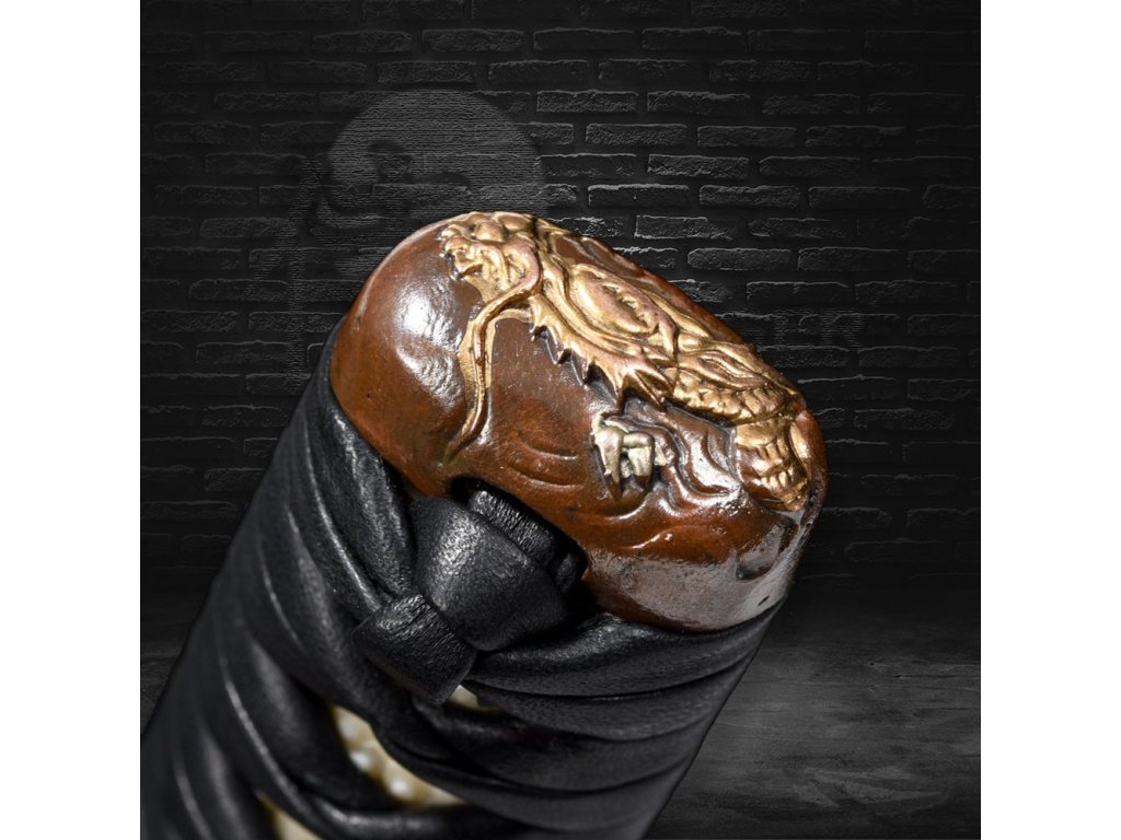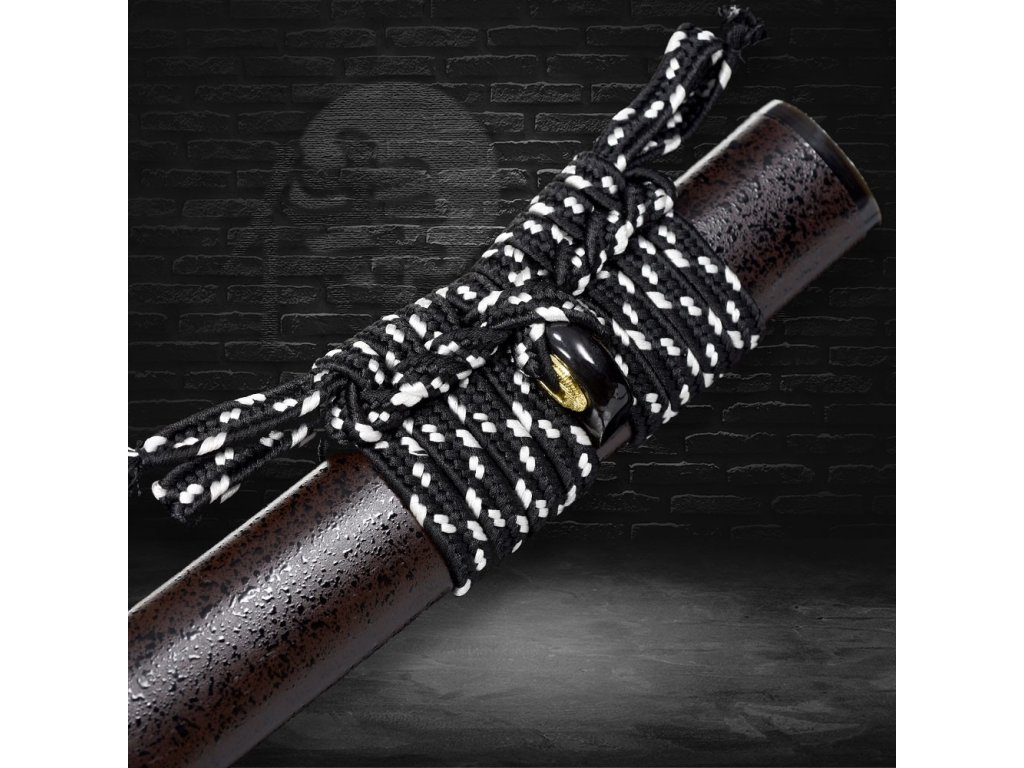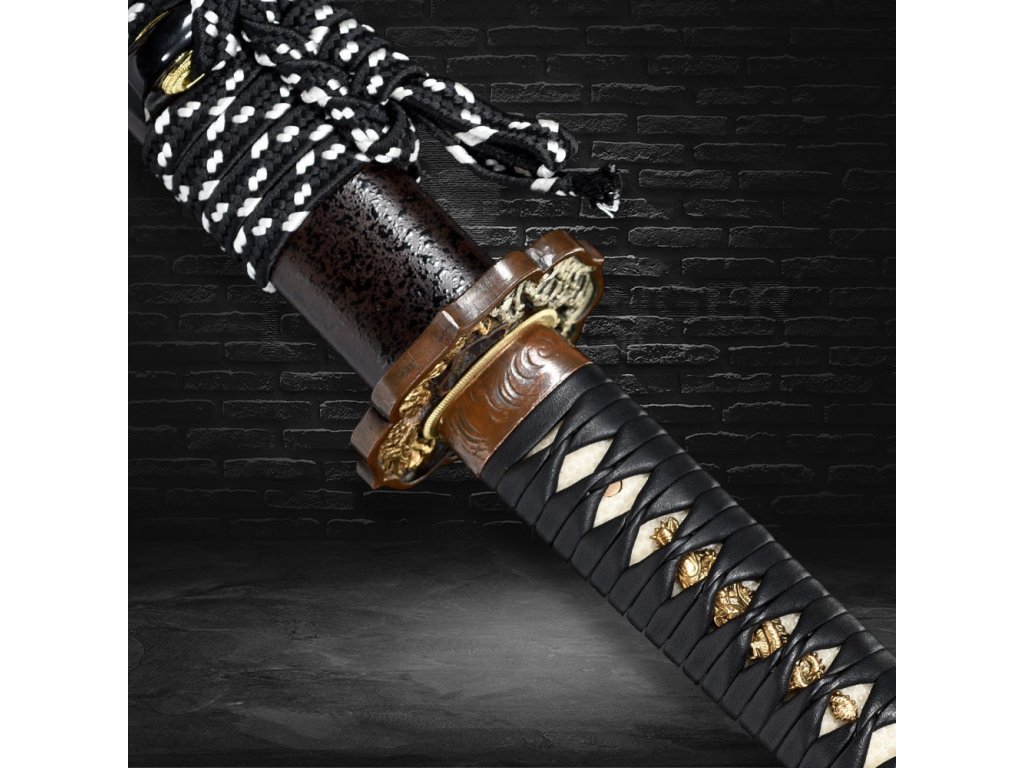 ✅ Tsuka - dřevěné jádro, potažena pravou rejnočí kůží (Samegawa), s černou koženou omotávkou. Čepel zajištěna 1 bambusovým kolíkem "mekugi"