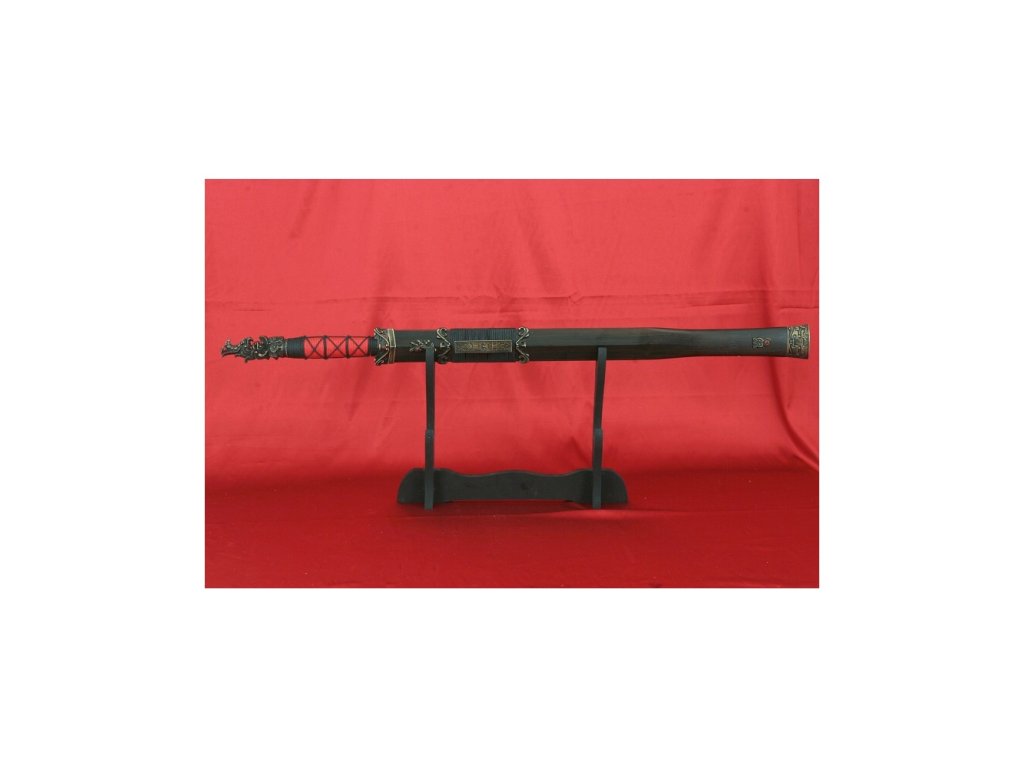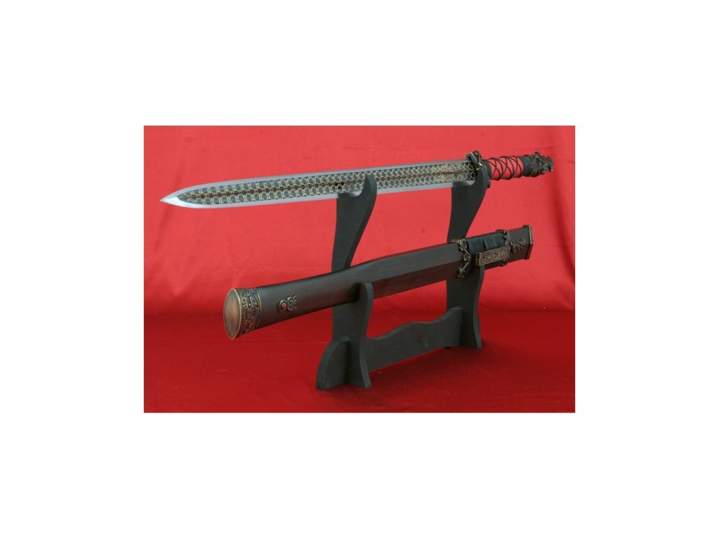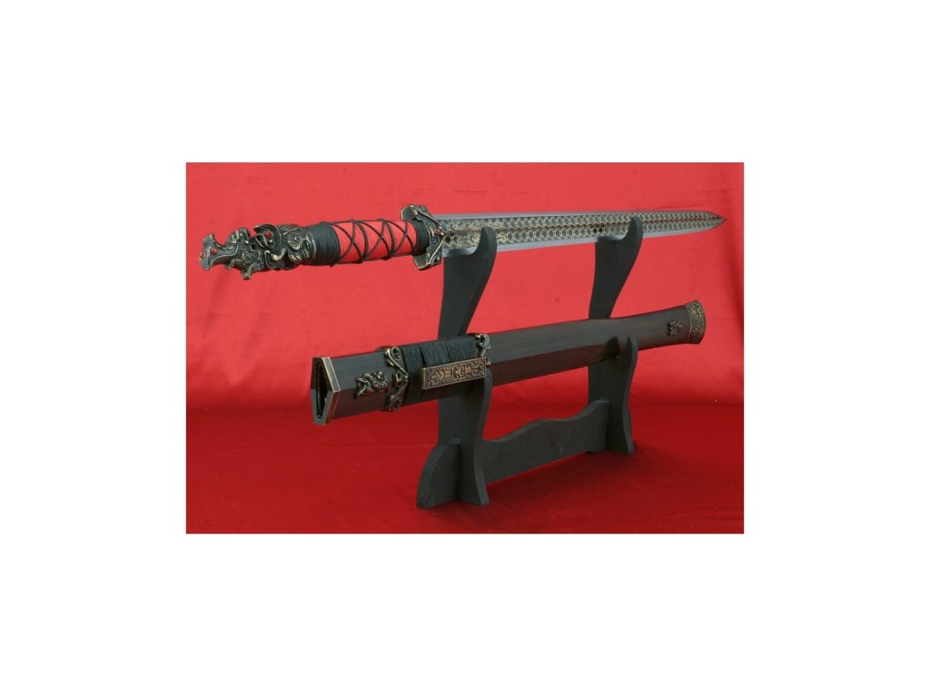 Ručně kovaný čínský meč Han Dynasty Jian od firmy Kawashima. Nejen funkční, ale současně i dekorativní ostrý meč, čepel zdobená leptaným vzorem, opravdový kus železa se zdobenými detaily, dřevěná pochva.