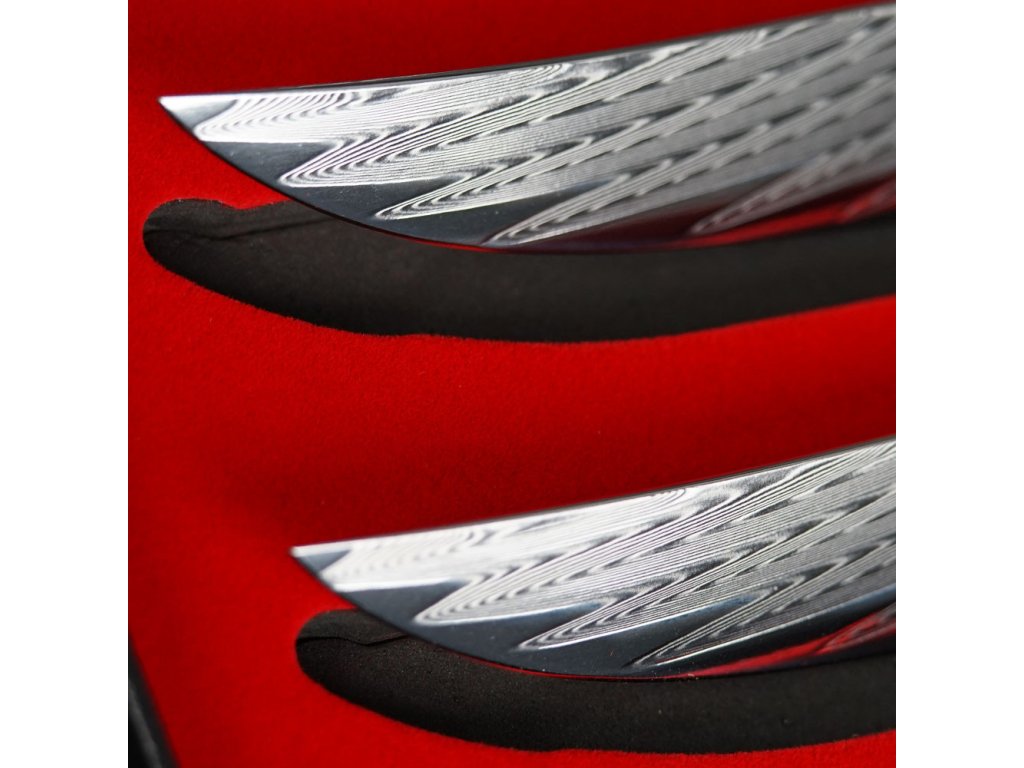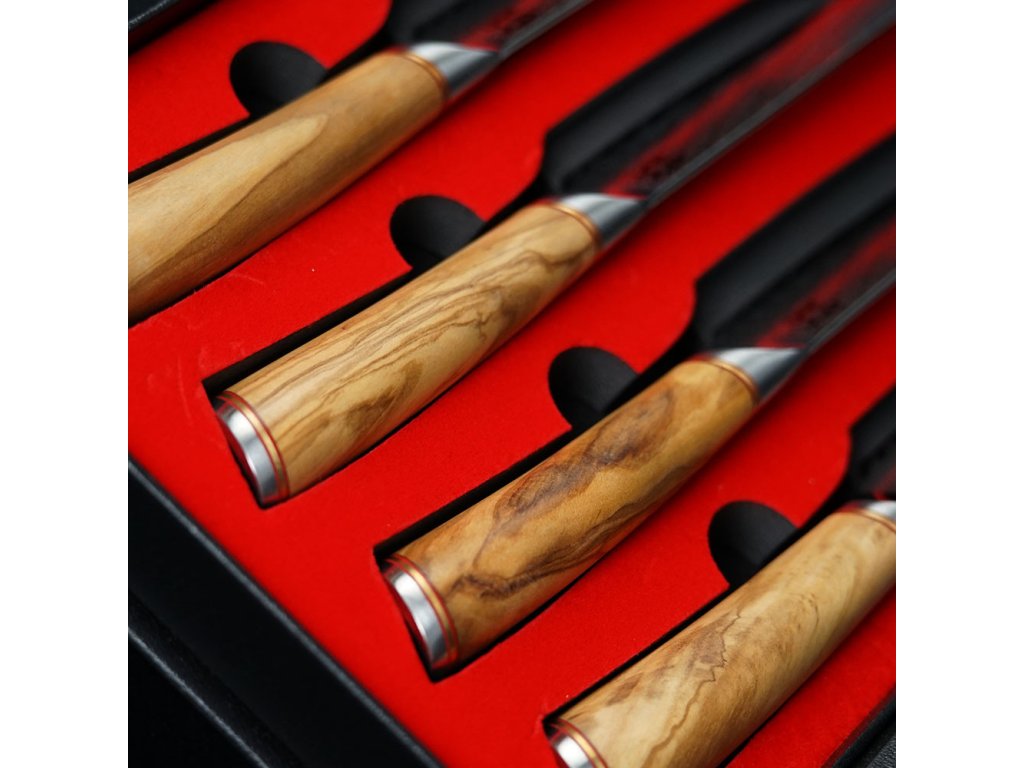 Každá rukojeť je vyřezaná z pravého olivového dřeva – ručně leštěná, ergonomická a doplněná mozaikovým nýtem. Pevná, tvrdá a přitom příjemná na omak. Prostě něco, co chceš mít v ruce pokaždý, když ti na talíř přistane kus masa.