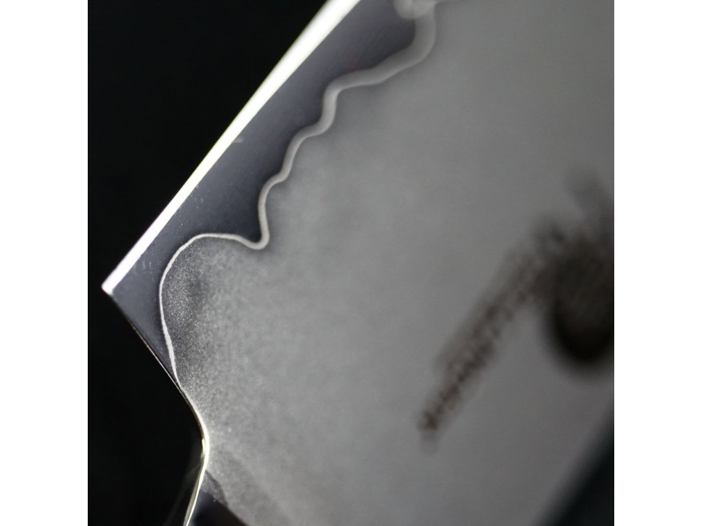 Ostří nožů ze série Dellinger Okami 3 layers je tvořena jádrem z japonské oceli AUS-10 o tvrdosti 58-62 Rockwella, které je vloženo mezi 2 vrstvy nerezových ocelí rozdílných tvrdostí, které zajišťují mimořádnou odolnost a houževnatost. Povrch nože je broušen do matného odstínu, tzv. stonewashed. Tato povrchová úprava snadno skryje škrábance. Díky mimořádné ostrosti a úhlu broušení 15 stupňů, si krájené produkty zachovají svůj tvar a strukturu.