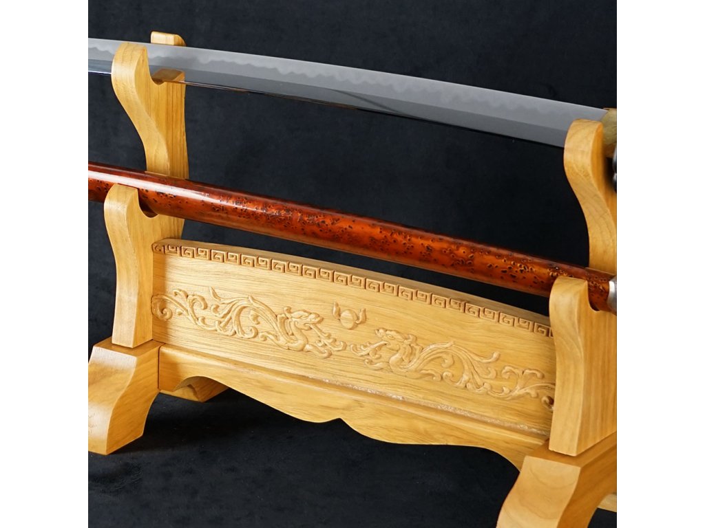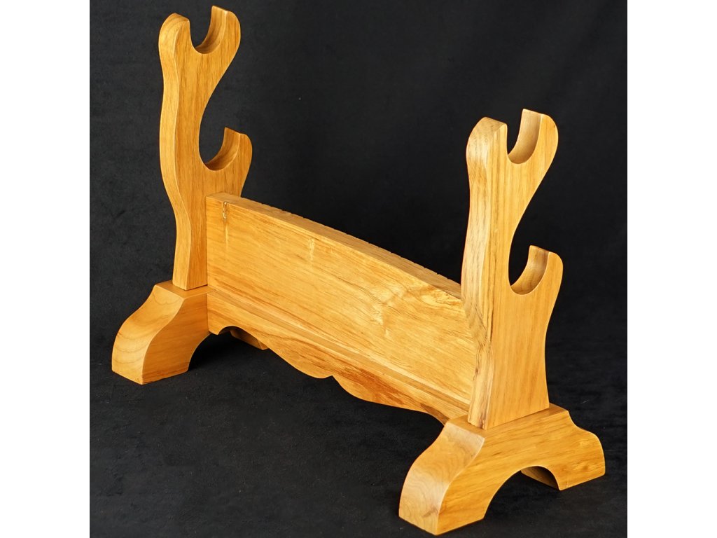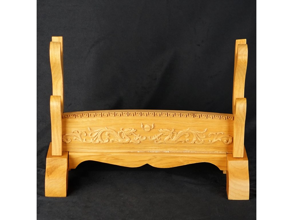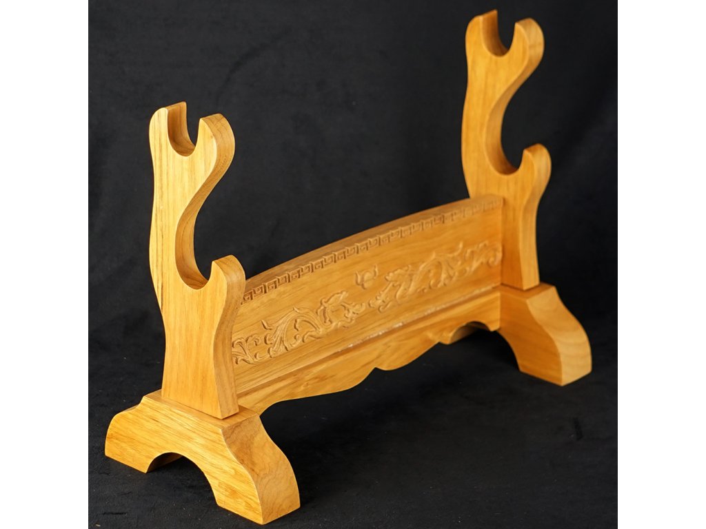 Prezentujte svůj oblíbený meč, katanu, nebo wakizashi stylově - na tomto dvoupatrovém výstavním a zdobeném stojanu. Tento krásný výstavní stojánek je vyroben z dřevěného masivu se vzory draků. Povrch je lakovaný a spojovací prvky jsou ze železa a mosazi.