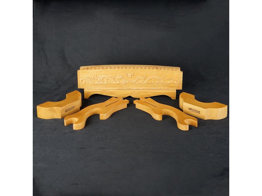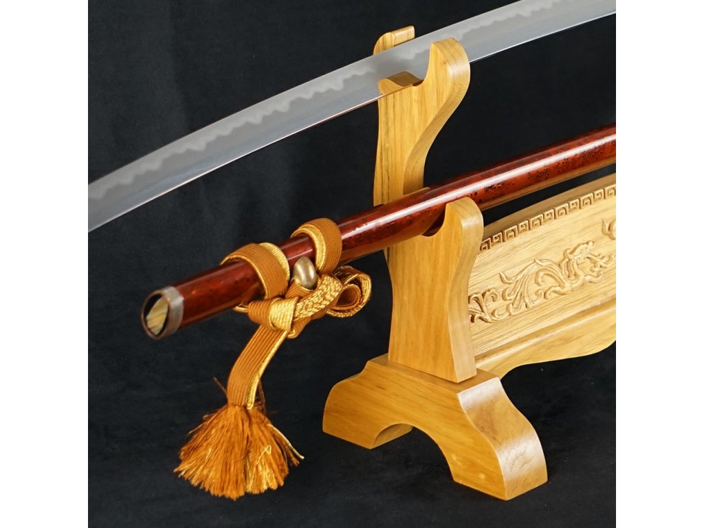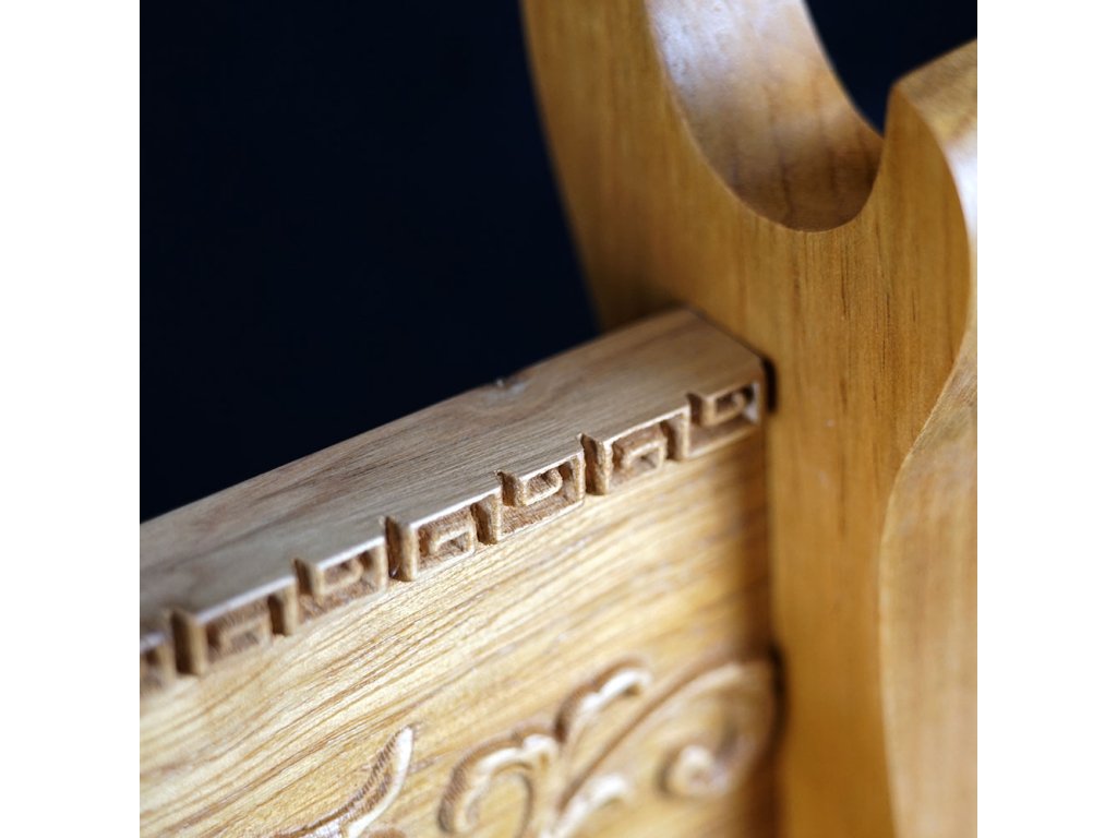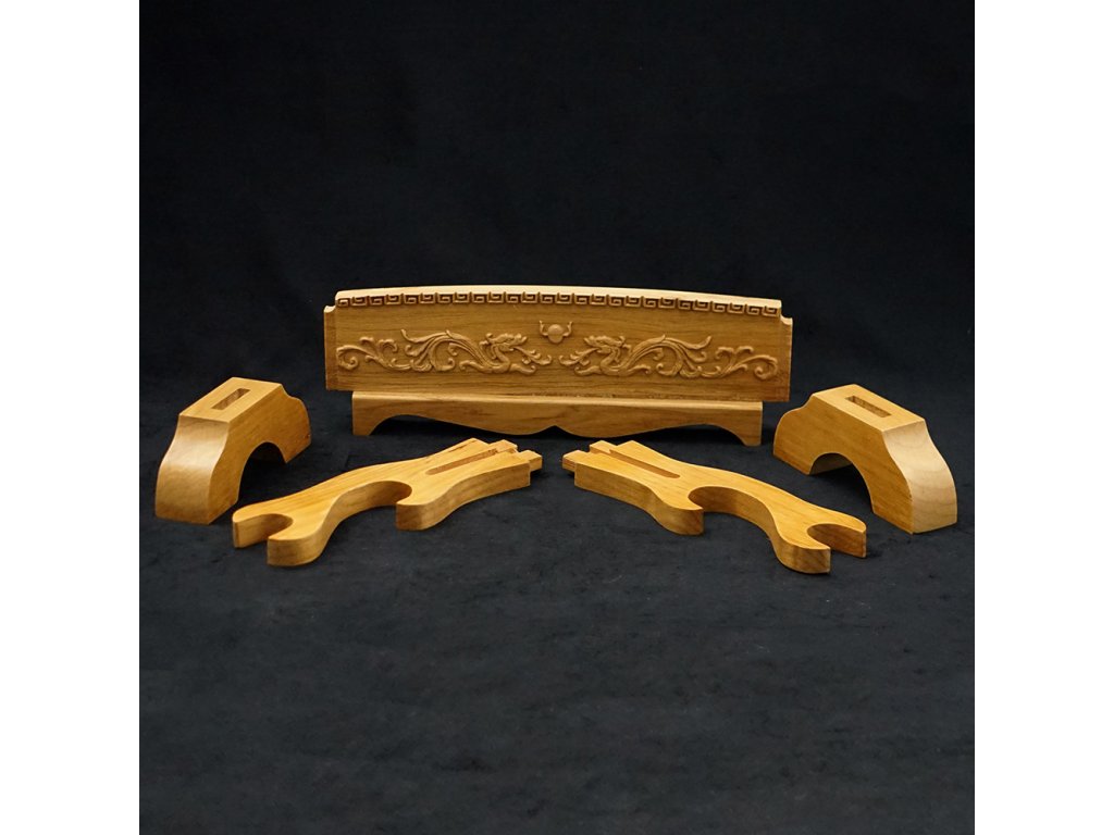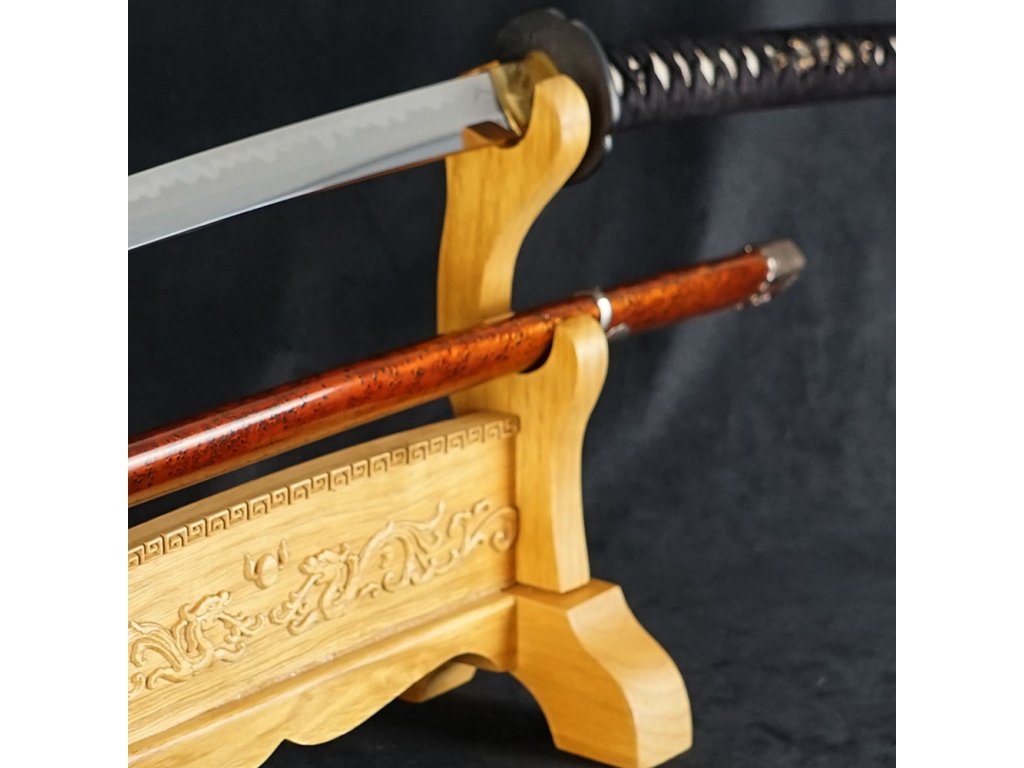 Prezentujte svůj oblíbený meč, katanu, nebo wakizashi stylově - na tomto dvoupatrovém výstavním a zdobeném stojanu. Tento krásný výstavní stojánek je vyroben z dřevěného masivu se vzory draků. Povrch je lakovaný a spojovací prvky jsou ze železa a mosazi.