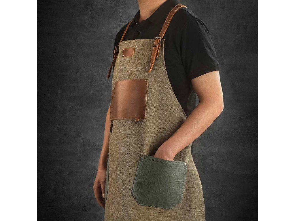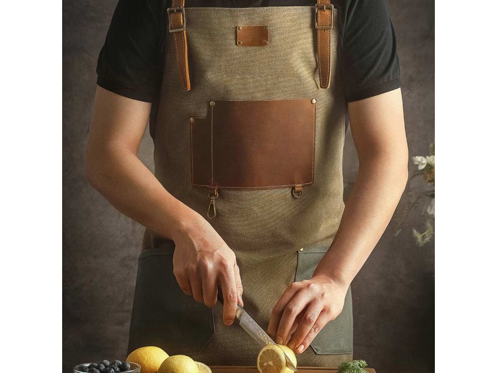 Stylová zelená zástěra z plátna a pravé kůže – funkční design pro každého mistra kuchyně
