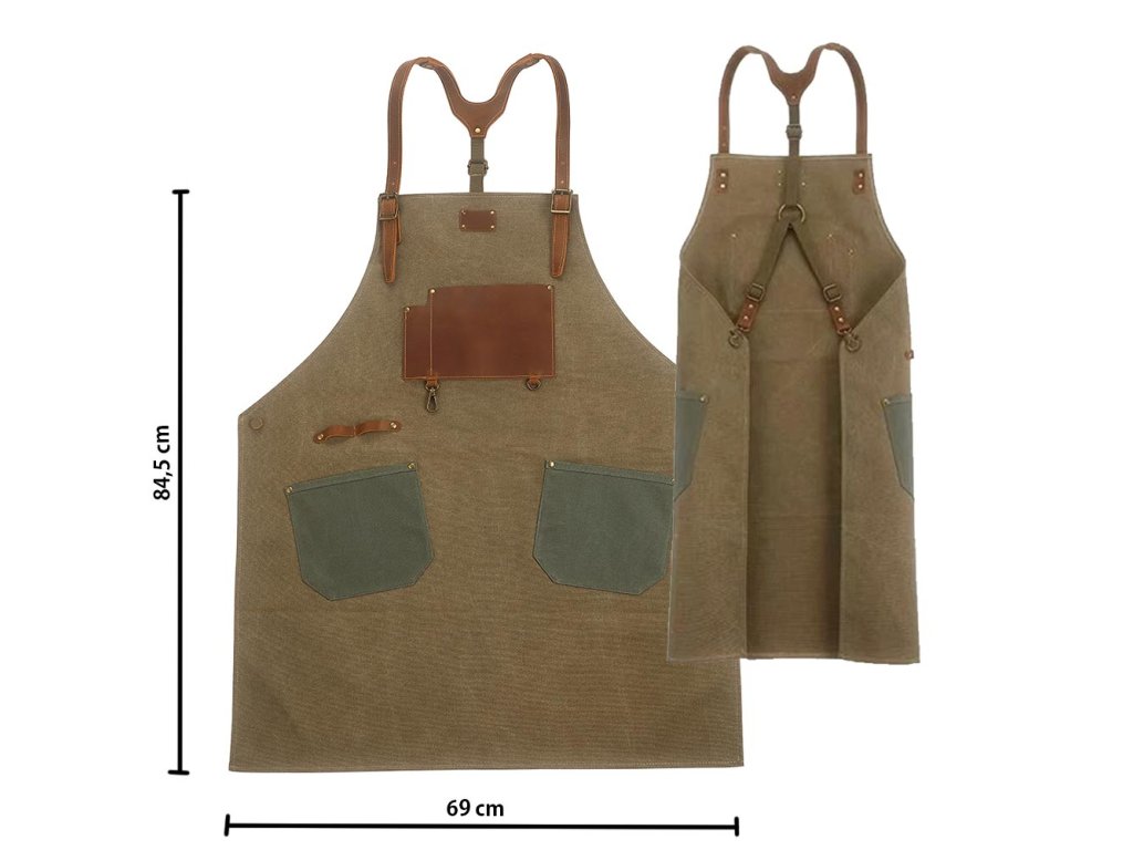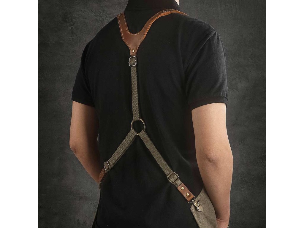 Zástěra má nastavitelné popruhy s koženými detaily, které se na zádech kříží do „Y“ – takže perfektně sedí, nepadá a neškrtí. Díky kovovým kroužkům, pevnému šití a kůži v namáhaných místech vydrží i náročné používání v profi kuchyni nebo při grilování.