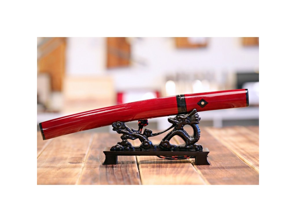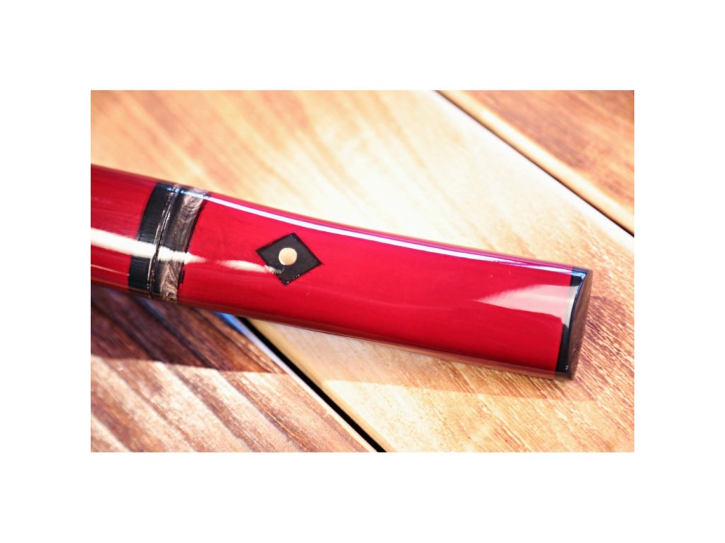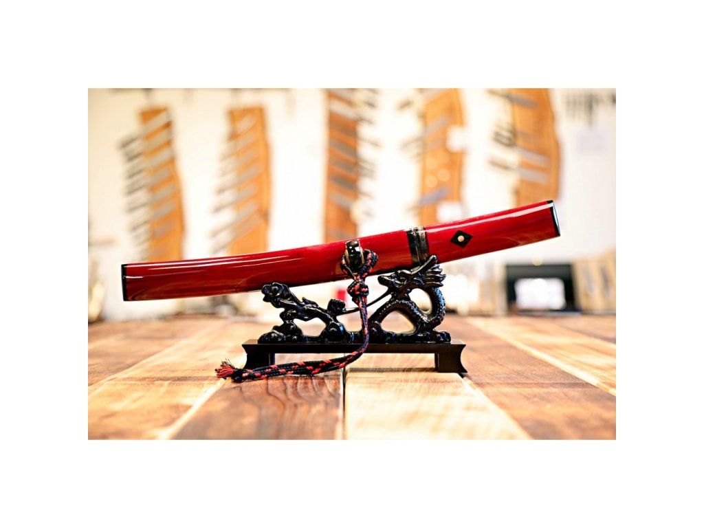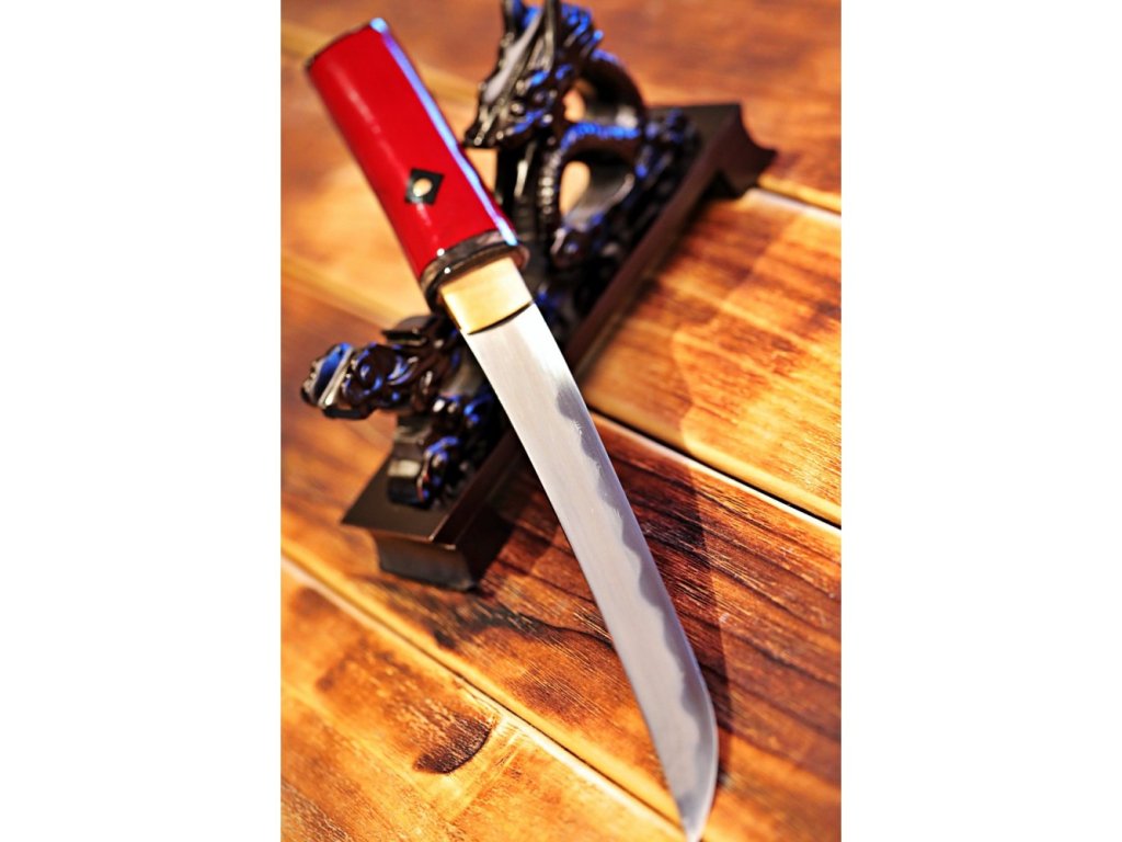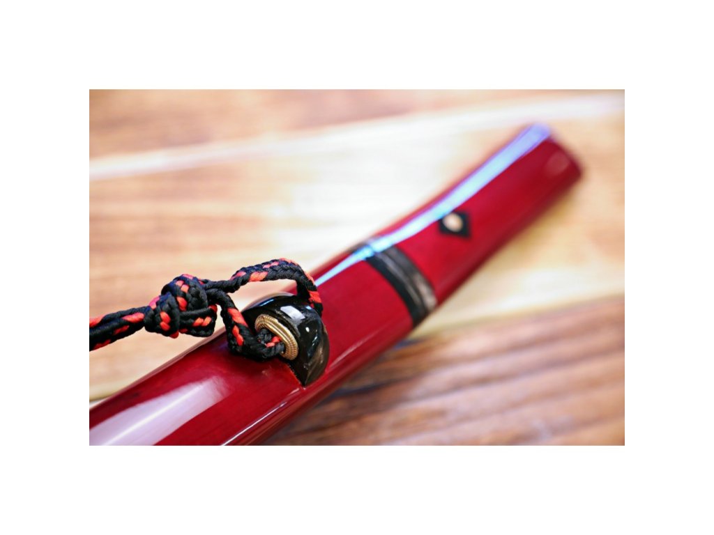 Kovaný japonský meč TANTO s reálným hamonem Choji. Ostrý (broušený) samurajský meč tanto najde své uplatnění jako dekorace, ale i k aktivnímu nácviku bojového umění. Ocel je parciálně zakalena, má stupeň tvrdosti 48 HRC. Atraktivní a ostrá čepel, červená lesklá saya plus tsuka (rukojeť), to vše dělá toto tanto velmi zajímavým a žádaným. Tanto je uloženo v plátěném vaku a papírové krabici. Ostří tanta zdobí reálný hamon Choji. Firma Dellinger se zříká jakékoliv odpovědnosti za zranění a poškození vzniklá při použití. Schraňujte tanto mimo dosah dětí ! Jakákoliv manipulace se samurajským mečem je na vaší vlastní odpovědnost. Nezapomeňte, že máte ve svých rukou smrtelnou zbraň !