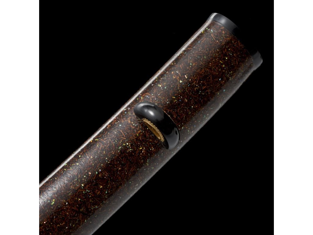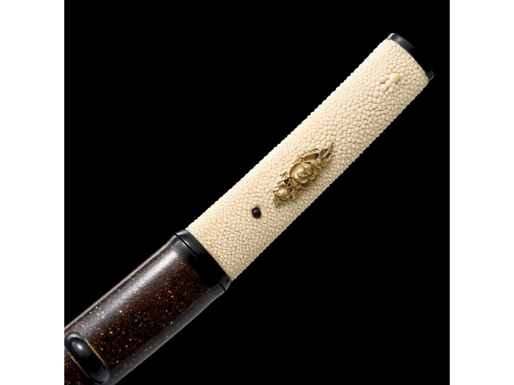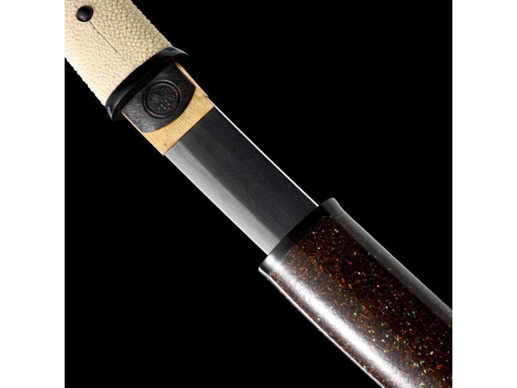 Saya: (plášť - obal) vyroben z tvrdého dřeva a pokrytý pryskiřicí s drcenými lístky palmových listů (dávná japonská metoda zdobení saya)
