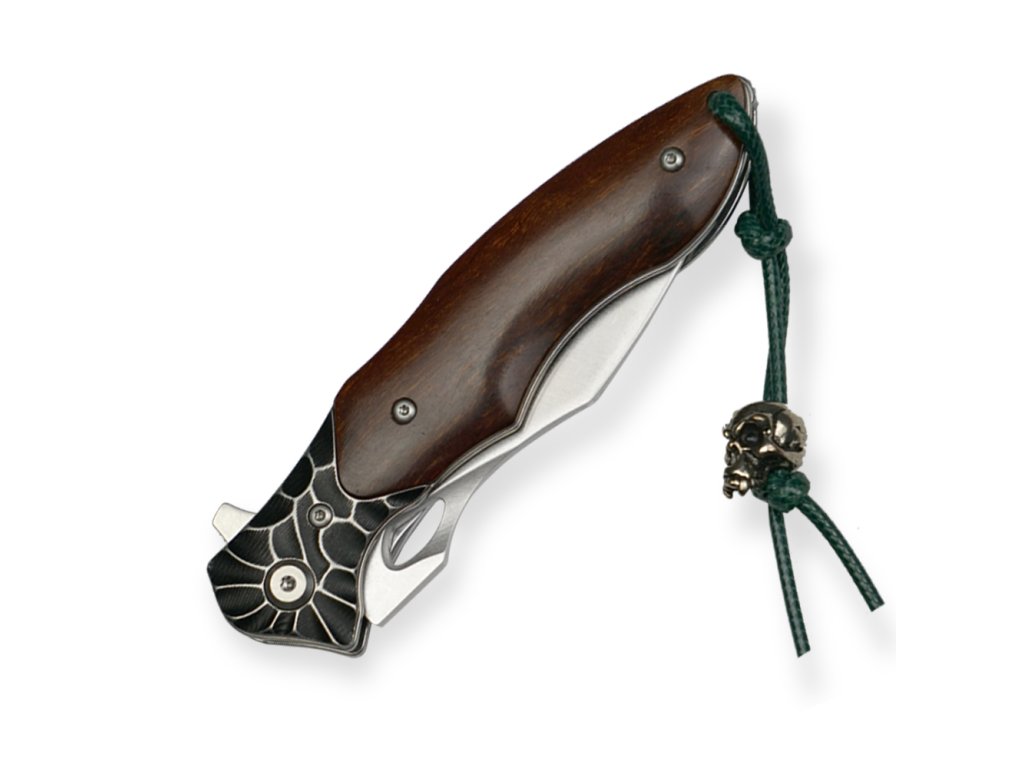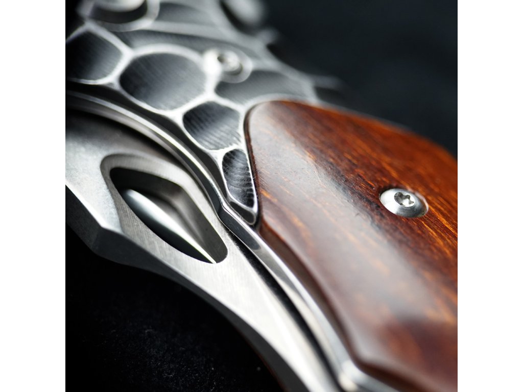 - Rukojeť je vyrobena z Desert Iron Wood, což je velmi tvrdé dřevo pocházející z pouští v USA. Toto dřevo je známé svou odolností a exotickým vzhledem díky rozmanité barevné paletě od světlého medu po jemný oranžový nádech. Je ergonomicky tvarované pro vynikající ovládání.