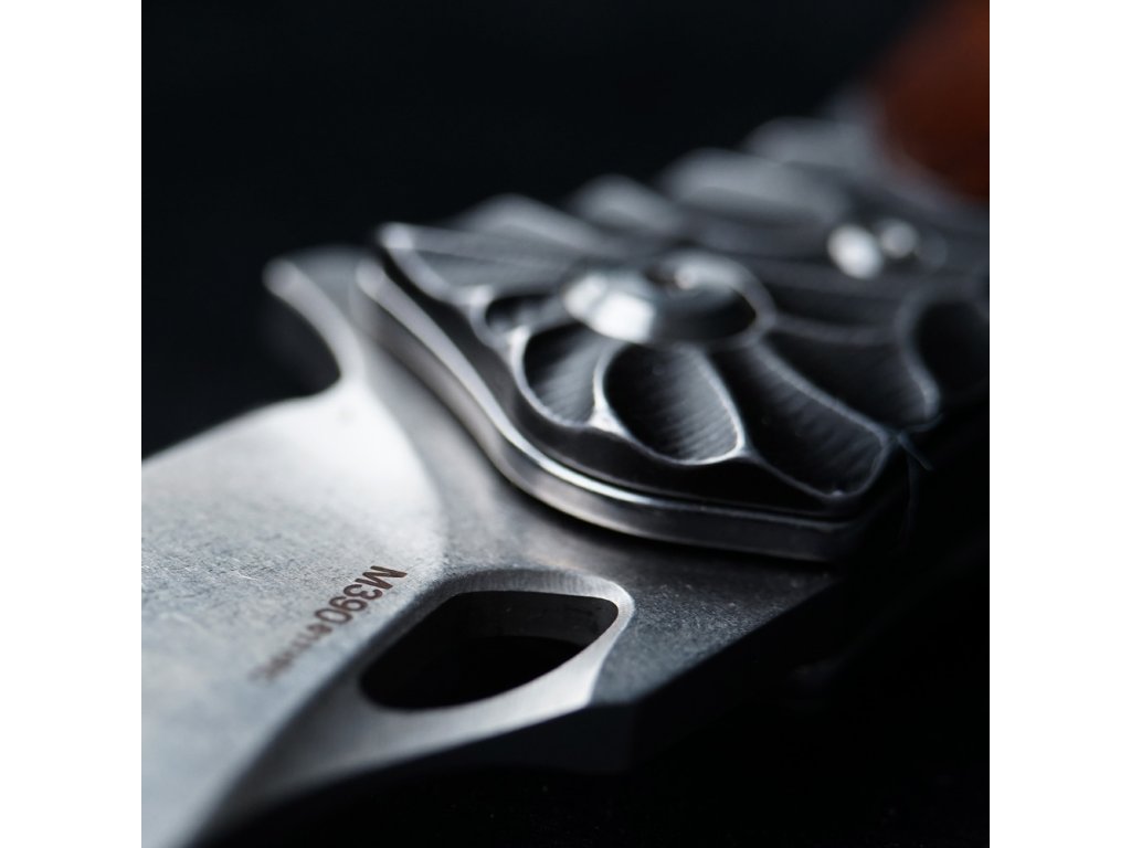 - Doporučuje se pravidelná údržba nože pro zachování jeho výkonu a vzhledu. Ocel M390 je velmi odolná, ale je důležité odstranit částečky látek přilepené na čepeli a pravidelně ji olejovat.